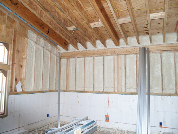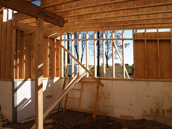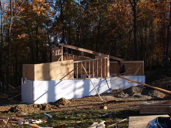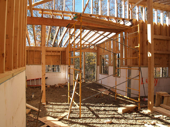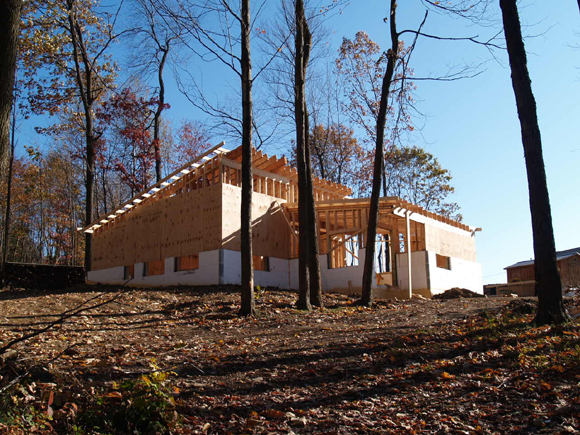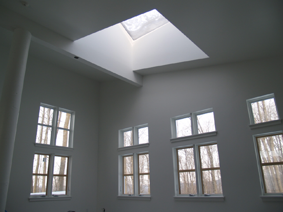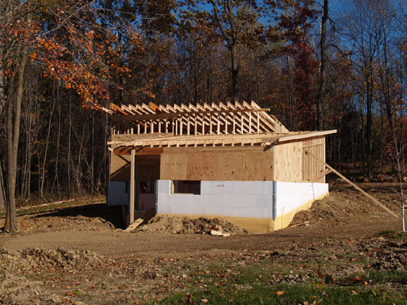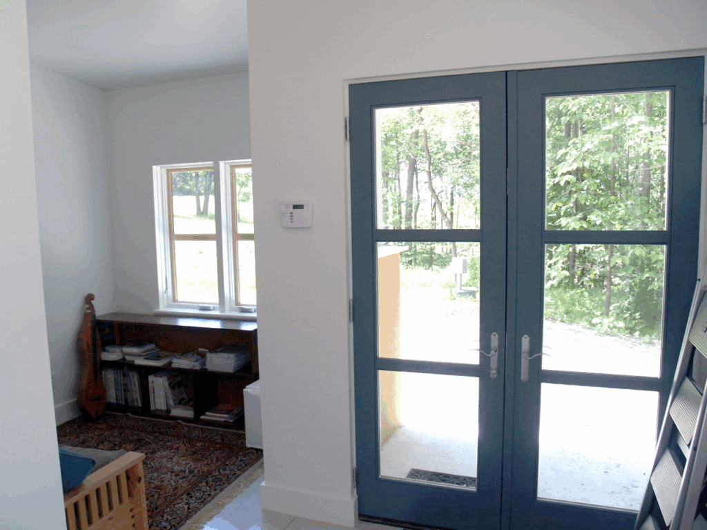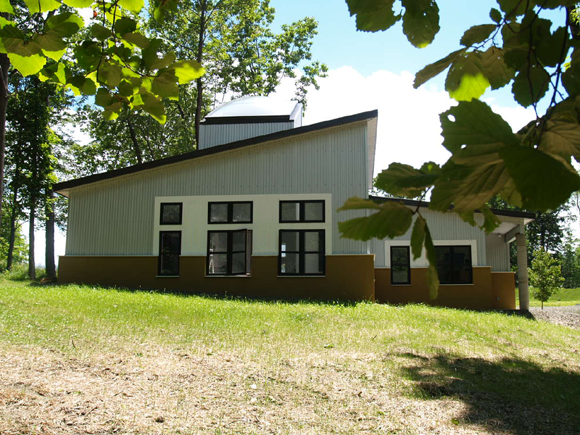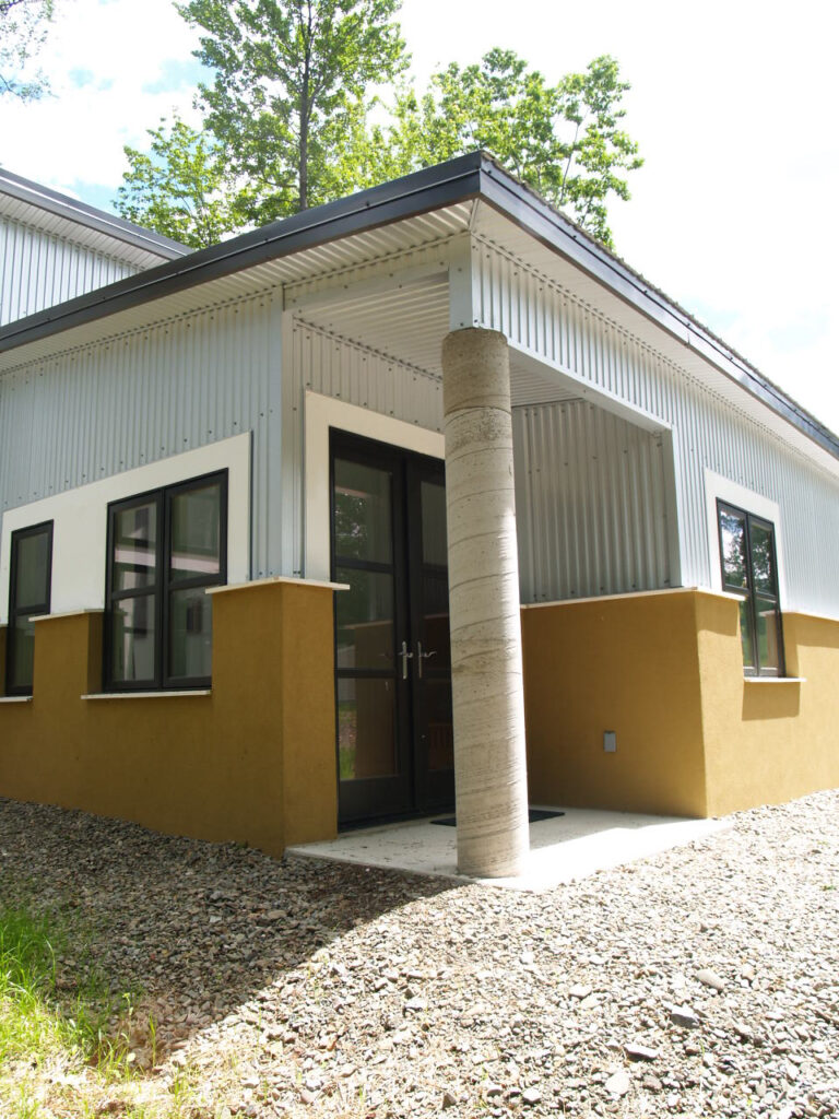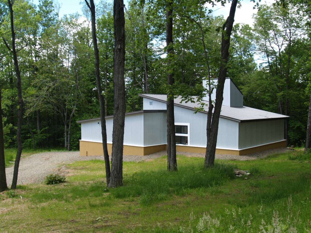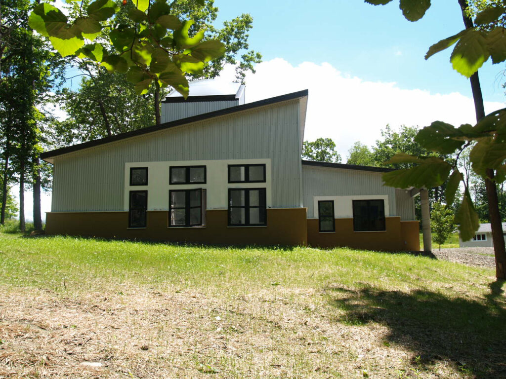 Nestled within a wooded hillside, the design embraces the site’s natural slope—berming a portion of the structure into the landscape to enhance insulation and connection to the terrain. The studio incorporates insulated concrete form (ICF) low walls, high R-value insulation, a heat recovery ventilation (HRV) system for continuous fresh air, and high-efficiency heating equipment, achieving both comfort and sustainability in equal measure.