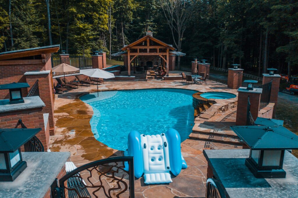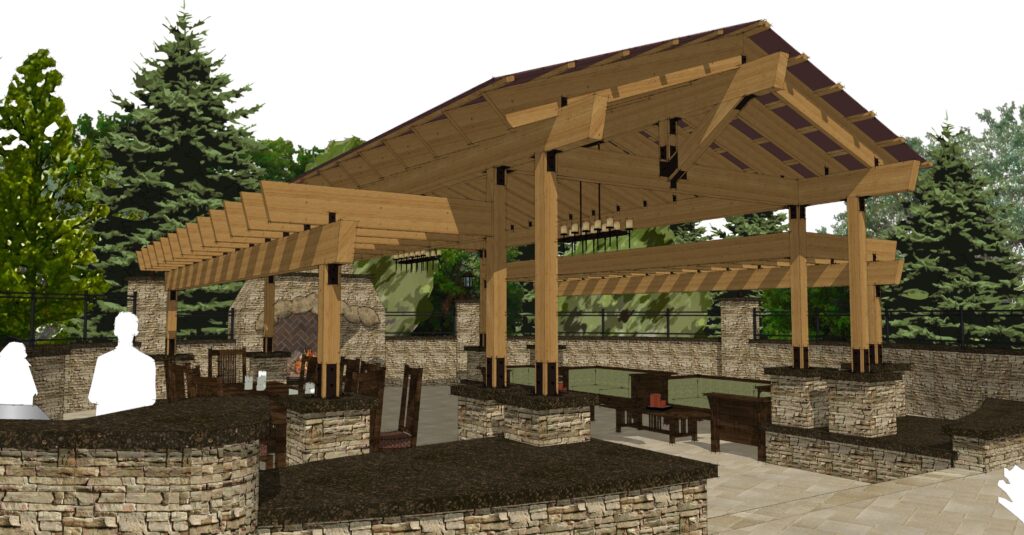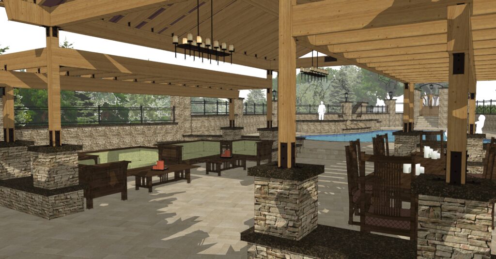 Overlooking the pool, a timber-frame pergola pavilion serves as the heart of the outdoor experience—complete with a fireplace, outdoor kitchen, and generous gathering space. Warm natural materials, layered textures, and broad views to the wooded backdrop create a retreat-like atmosphere that elevates everyday living into something memorable.